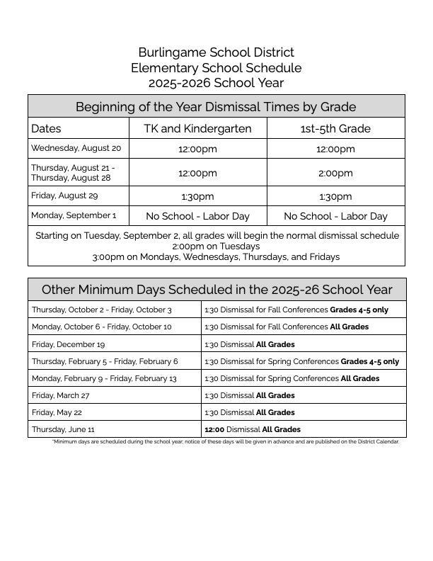 Minimum Day Schedule is 8:30am to 12pm for TK through fifth grade